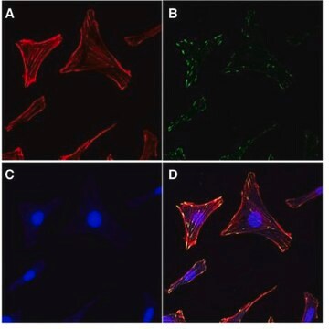 肌动蛋白细胞骨架和局灶性粘连染色试剂盒由三个组件(TRITC结合的鬼笔环肽,抗纽蛋白和DAPI)组成,用于对细胞骨架,局灶性接触以及细胞核中的肌动蛋白丝进行免疫荧光染色。