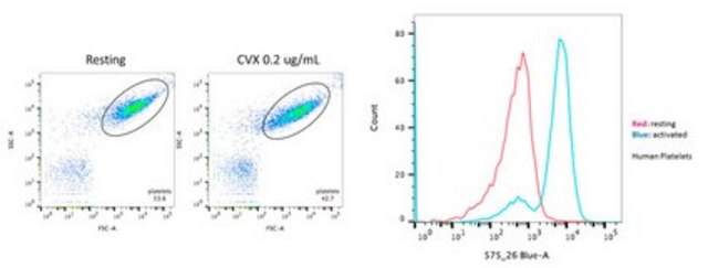 Flow Cytometry Analysis: A 1:200 dilution from a representative lot detected Platelet in freshly isolated human platelets activated with convulxin (Courtesy of Shuchi Gupta, PhD, University of Pennsylvania, USA).