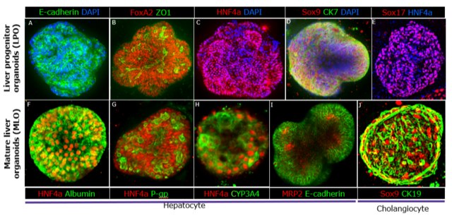 The 3dGRO® Human iPSC Derived Liver Organoid Progenitor express key liver progenitor markers HNF4a, SOX17, FOXA2 and SOX9, and showed proper apical and basal-lateral polarization marked by E-cadherin and ZO1 expression. 3dGRO® Human iPSC-derived Liver Progenitor Organoids can be differentiated into mature liver organoids containing functional hepatocytes and cholangiocytes when cultured in differentiation media for 14 days.