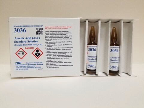 This Standard Reference Material (SRM) is intended for use as a primary calibraion standard for the quantitative determination of the arsenic species arsenic acid (AsV). This product can be used for quality assurance when assigning values to in-house control materials. A unit of NIST3036 consists of two 1mL sealed borosilicate glass amber ampoules of an acidified aqueous solution prepared gravimetrically to contain a known mass fraction of arsenic acid.