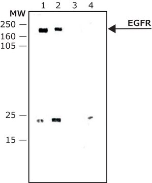 Monoclonal Anti-EGFR (mouse IgG1 isotype) is derived from the hybridoma 225 produced by the fusion of mouse myeloma cells (NS-1-503 cells) and splenocytes from BALB/c mice immunized with partially purified EGF receptors from A-431 cells. The receptor for epidermal growth factor (EGF) is an integral cell membrane glycoprotein of 170 kDa, which spans the membranes of a wide range of normal and malignant epithelial cells. The EGF receptor has an intracellular domain that exhibits tyrosine kinase activity.