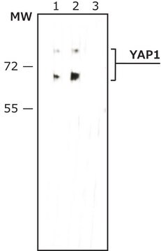 Monoclonal Anti-phospho-YAP1 (pTyr357) (mouse IgM isotype) is derived from the hybridoma PYP-76 produced by the fusion of mouse myeloma cells and splenocytes from BALB/c mice immunized with a synthetic phosphopeptide corresponding to a fragment containing (pTyr357) of human YAP1 conjugated to KLH. Yes-associated protein 1 (YAP1) is a modular adapter protein with multiple protein interaction domains that was originally identified based on its interaction with the Src-family tyrosine kinase c-Yes. YAP1 contains a proline-rich amino terminus, a WW domain, a coiled-coil and a PDZ-binding motif at the extreme C-terminus.