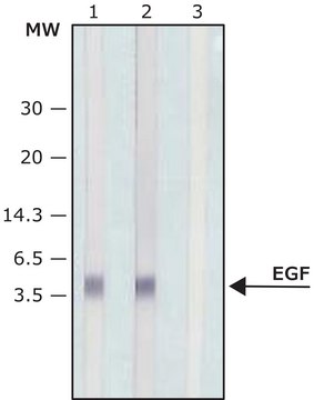 Monoclonal Anti-Epidermal Growth Factor (EGF) (mouse IgG1 isotype) is derived from the EGF-10 hybridoma produced by the fusion of mouse myeloma cells and splenocytes from an immunized mouse. Epidermal growth factor (EGF) is a single chain polypeptide hormone (6 kDa). EGF protein exists largely in a β-sheet conformation, with a C-terminal hairpin that may be involved in receptor binding. Human EGF is found in body fluids such as urine, milk, saliva, sweat, and seminal fluid and has its highest concentration in α-granules of blood platelets.