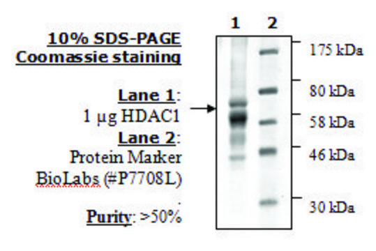 Human HDAC1, GenBank Accession No. NM_004964, full length with C-terminal HIS-DDDDK tag (FLAG) and C-terminal His-tag, MW = 56 kDa, expressed in baculovirus expression system.
