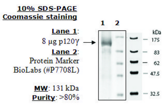 Human p120γ ( GenBank Accession No. AF327656), full length with N-terminal His tag, MW = 131 kDa, expressed in a Baculovirus infected Sf9 cell expression system.