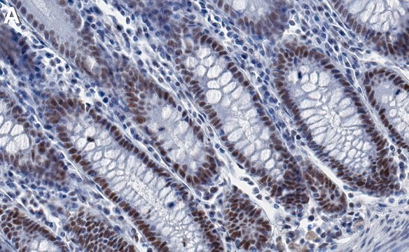 Immunohistochemistry (Paraffin) Analysis: A 1:100 dilution from a representative lot detected MLH1 in human colon tissue sections.