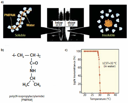 PNIPAM可溶于有机溶剂,如氯仿、丙酮、甲醇和各种其他醇类。只要溶液保持在一定的冷却环境,其便可溶于水。将PNIPAM水溶液加热至32℃(浊点(CP)或较低临界溶解温度(LCST)),可立即将澄清溶液转化为乳状悬浮液。这种现象是可逆的:一旦乳状悬浮液冷却到32℃以下,它就会恢复澄清。3 在20世纪60年代后期,Heskins和Guillet发表了水/ PNIPAM系统的第一个相图,该相图是通过测定相变温度作为PNIPAM浓度的函数来构建的。4 大约在同一时间,人们发现交联的PNIPAM网络(凝胶)在水中也表现出奇特的性质:它们在冷水中高度溶胀,但一旦加热到32℃以上就会收缩。与PNIPAM溶液的情况一样,凝胶的行为是可逆的,一旦冷却到32℃以下就会膨胀回原来的体积。通过凝胶进行数百次膨胀/收缩循环,没有发现材料疲劳的迹象。Allan S. Hoffmann注意到这种不同寻常的现象,他是第一批使用PNIPAM衍生物的温度诱导相变性质的人,他将这些衍生物作为控制与生物医学应用相关现象的触发器,例如染料或药物的释放。5 这项开创性工作奠定了响应系统领域的基础,该系统持续吸引着科学家的想象力。6 由于许多其他水溶性聚合物也具有浊点,所以PNIPAM水溶液显示出的热诱导相变并不是唯一的。然而,由于其相变的清晰度、接近体温的相变温度、聚合物本身的稳健性、以及关于聚合物本身和相变信息的可用性,使得PNIPAM仍然是生物医学应用的首选。